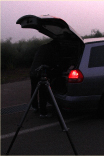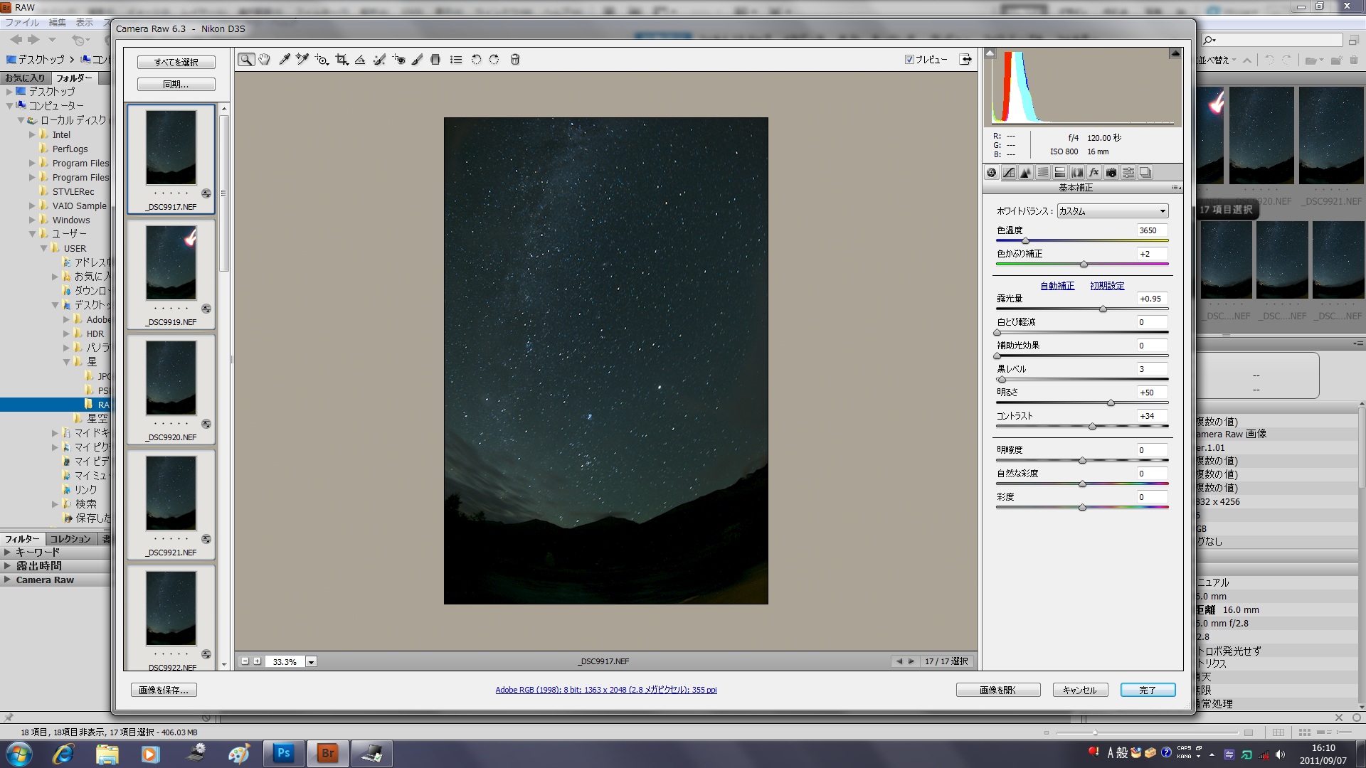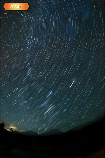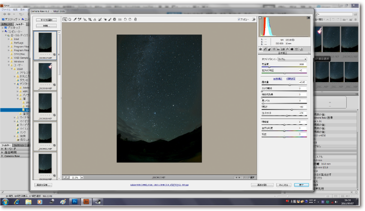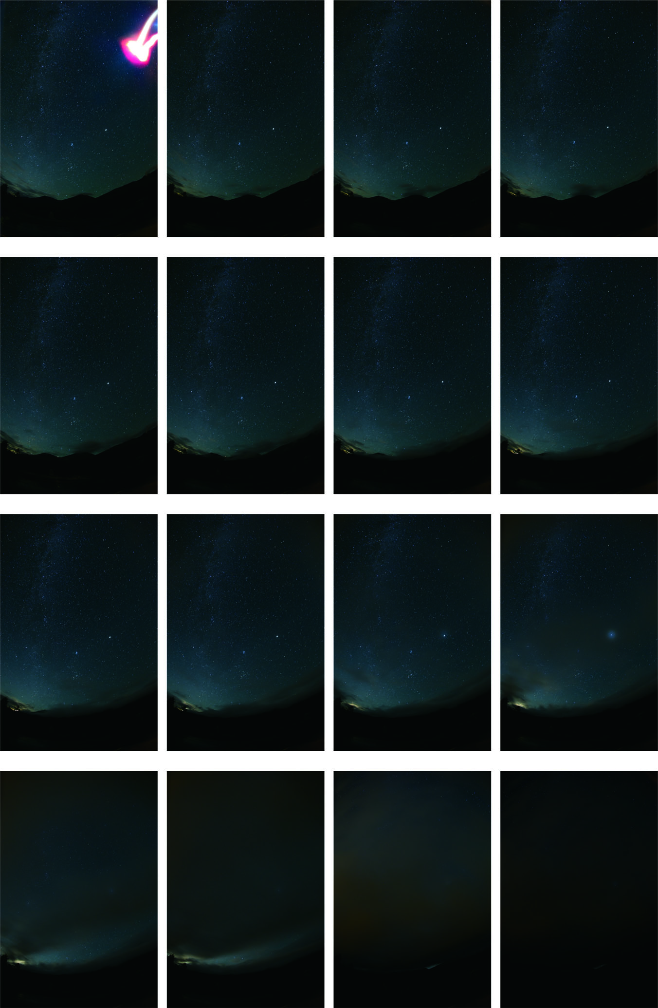 写真を撮るためには光の働きが必要不可欠ですが、極僅かな光しかない撮影環境ではどんな画像が撮れるのでしょうか。今回サンプル画像を撮影するためにロケへ出掛けたのは、 北海道の富良野・美瑛エリアの山間部にある望岳台というところです。望岳台(標高930m)は美瑛町市街地から約30kmに位置する大雪山系十勝岳(標高2077m)への登山口で、街の明かりの影響を受けにくいロケーションです。 晴れた日の夜空なら月明かりでも長時間露光で山の景色を写すことができるほど空気も澄んでいて、北海道ならではの撮影スポットではないでしょうか。カメラは駐車場から美瑛岳、十勝岳が連なる山頂方向の南東の方角118°へ向けてセットしました。 レンズは16mmのフィッシュアイを縦位置で使用したので、駐車場の地面(標高930mですが・・・)から見上げた空の真上あたりまでが収まります。ISO800で絞り4.0、シャッタースピードは120秒に設定して、 18枚撮り終えたところで広がり始めた雲があっという間に空を覆い尽くし大粒の雨が降り始めたので撮影を終了しました。山の天気は短時間で変化しやすいので、事前に天気予報をチェックしたり、 地元の観光協会に問い合わせをして情報を仕入れておくのもよいと思います。また夜間の山岳部の撮影では気温が極端に下がることもありますので、フリースなどの防寒着は必ず持参しましょう。 駐車場からの撮影なら突然の天候の変化でも機材を抱えて車に避難することもできるということも学びました(笑)。