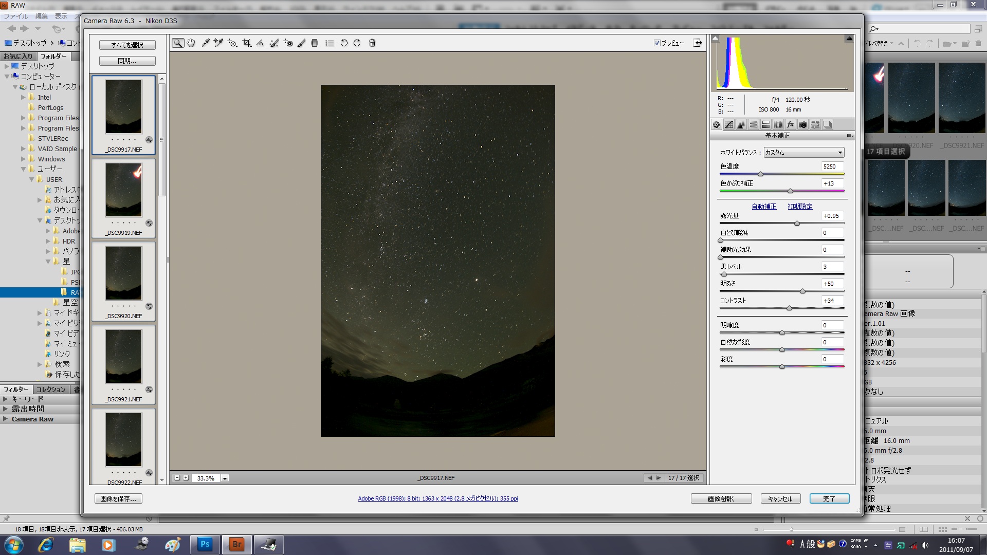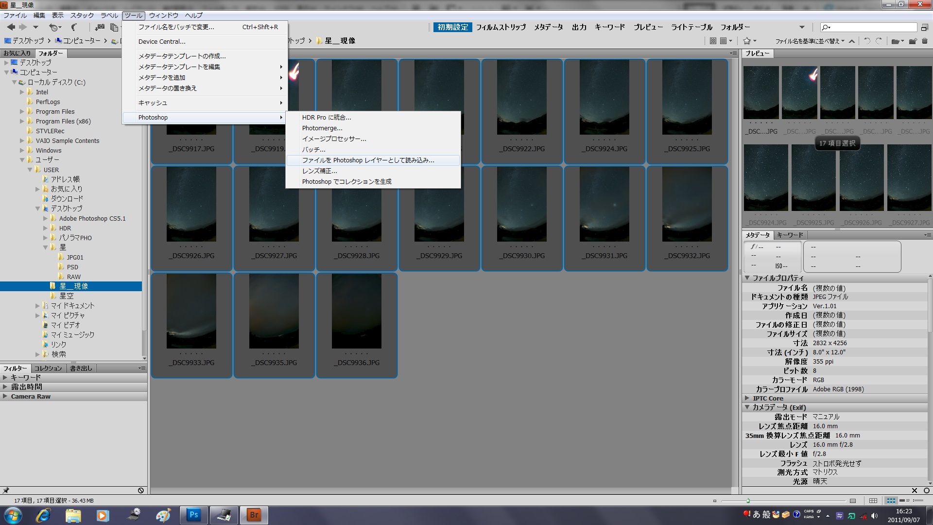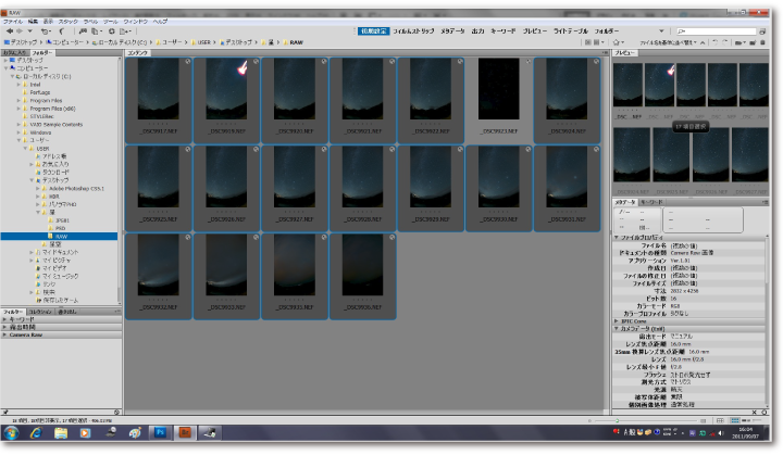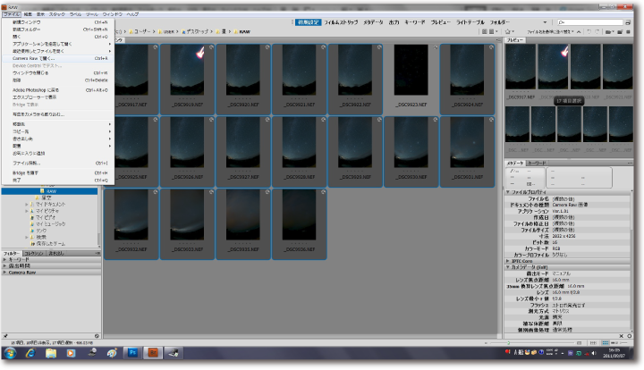 まずはRAWデータから色調整をしてJPGへ保存する。フォトショップの「ファイル」から「Bridgeで参照」をプルダウンし「フォルダー」でRAWデータの入ったフォルダを指定したら全部の画像を選択する。