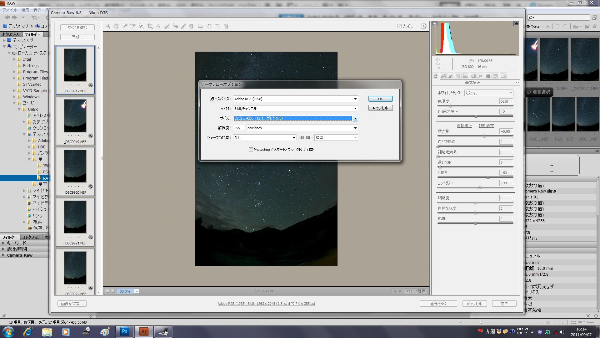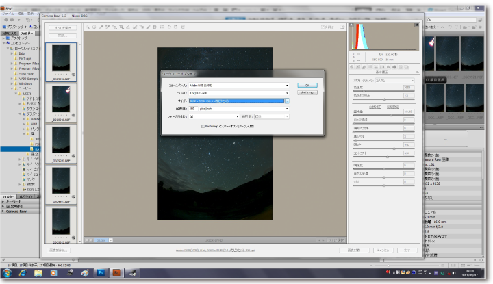 プレビュー画像の下に表示されている画像のサイズ(ここでは「Adobe RGB(1998);8bit; 1363×2048(2.8メガピクセル);355dpi」と表示)をクリックし 「ワークフローオプション」で「カラースペース」「解像度」などの各数値を調整し「OK」。