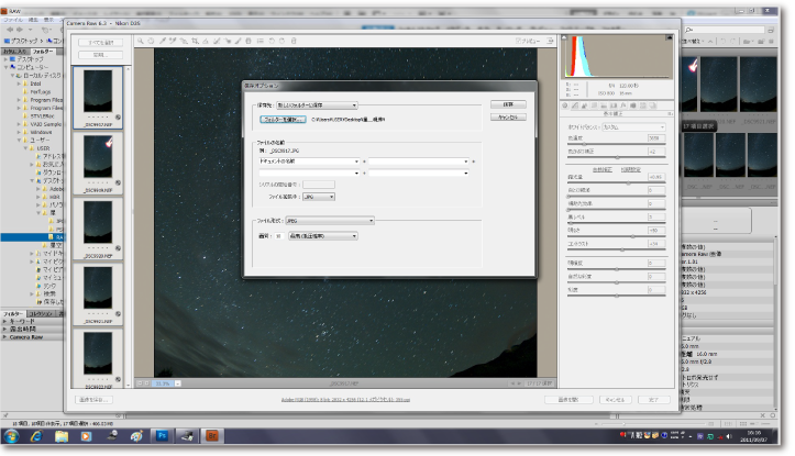 「ファイル」から「Camera Rawで開く」を選ぶと現像画面が表示されるので、左枠上部の「すべてを選択」で全画像の補正を準備。