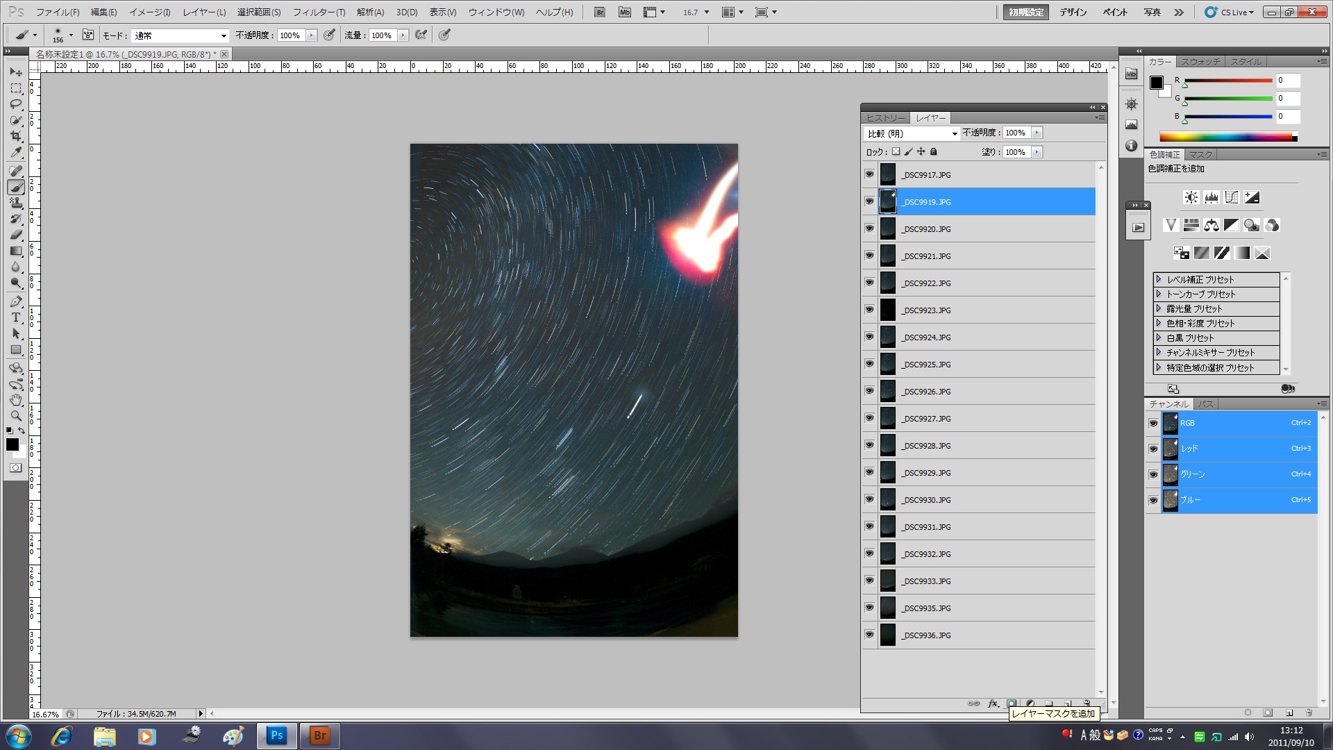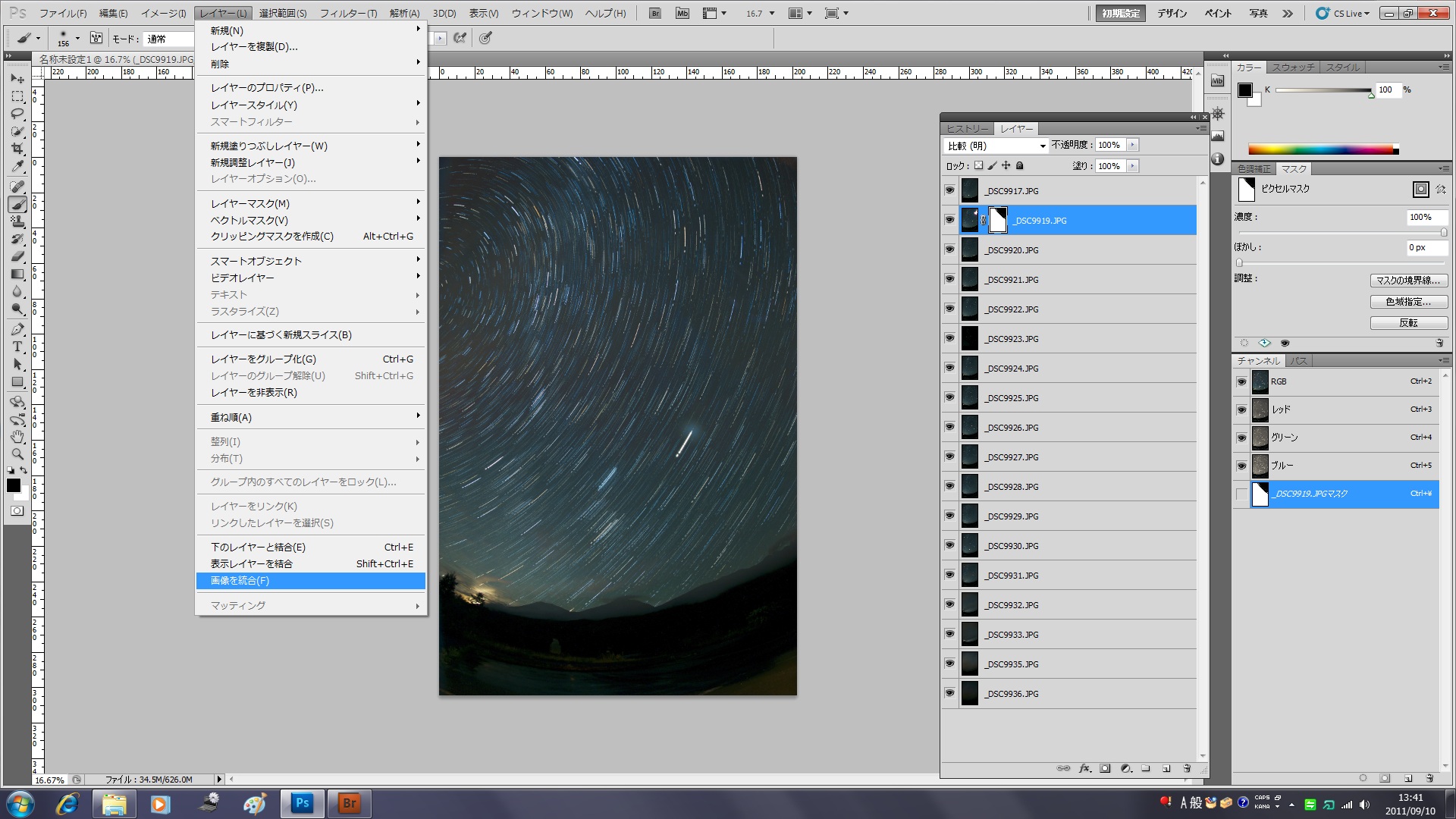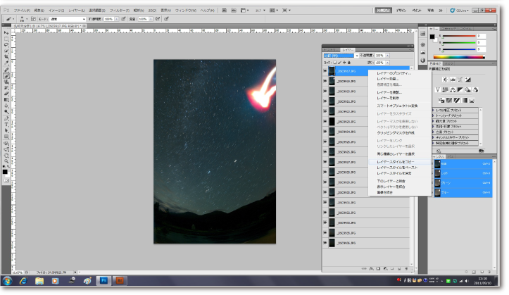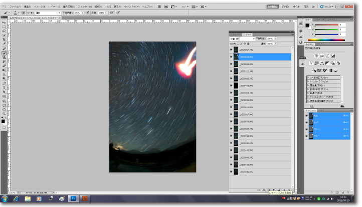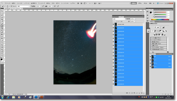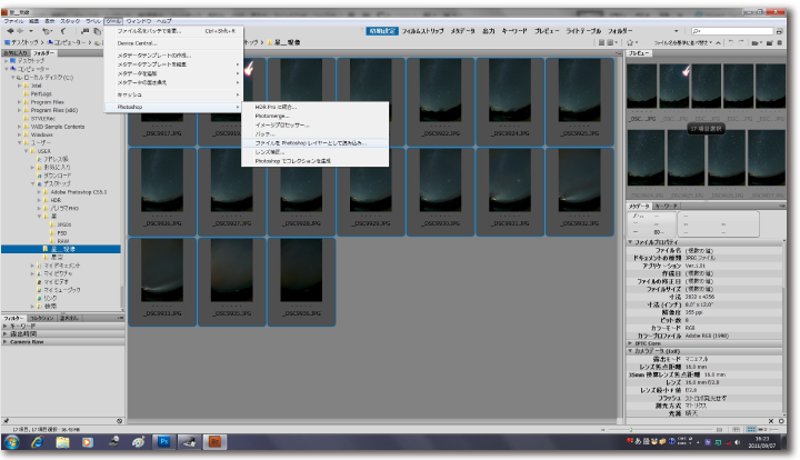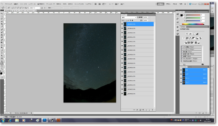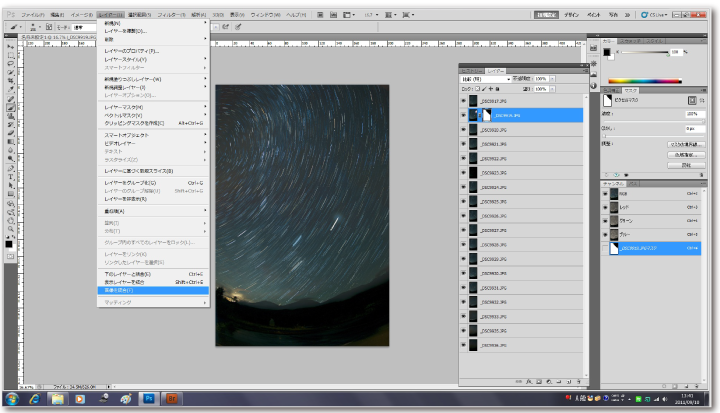 現像したJPGデータを全選択し「ツール」→「ファイルをPhotoshopレイヤーとして読み込み」で枚数分のレイヤーが作成される。