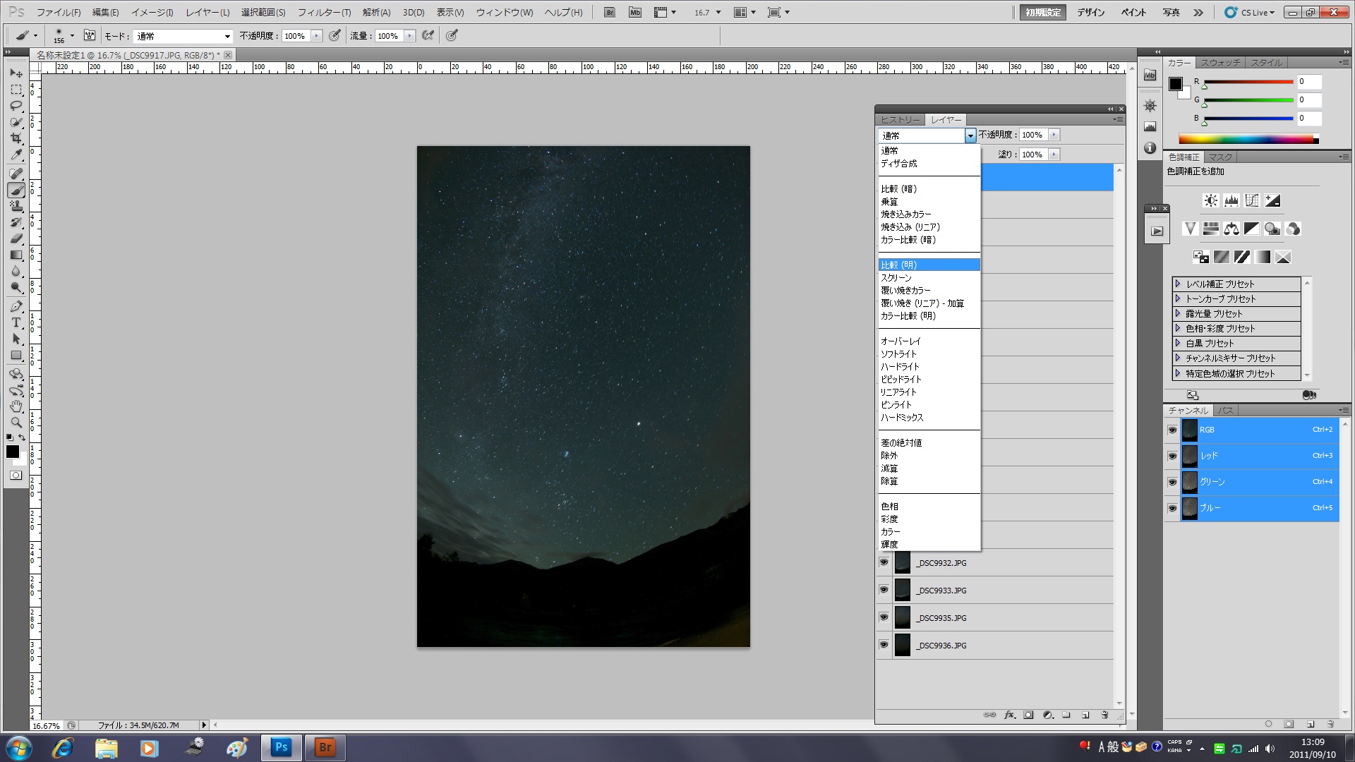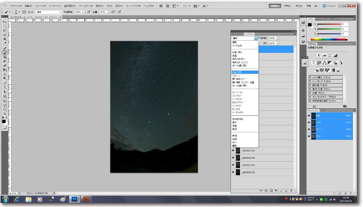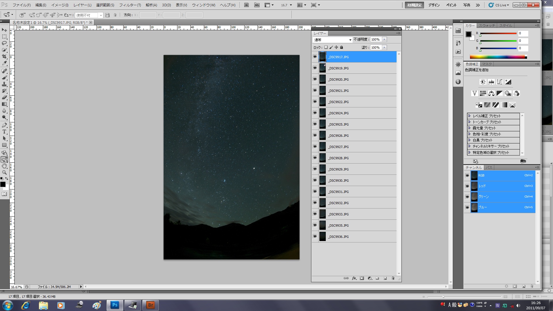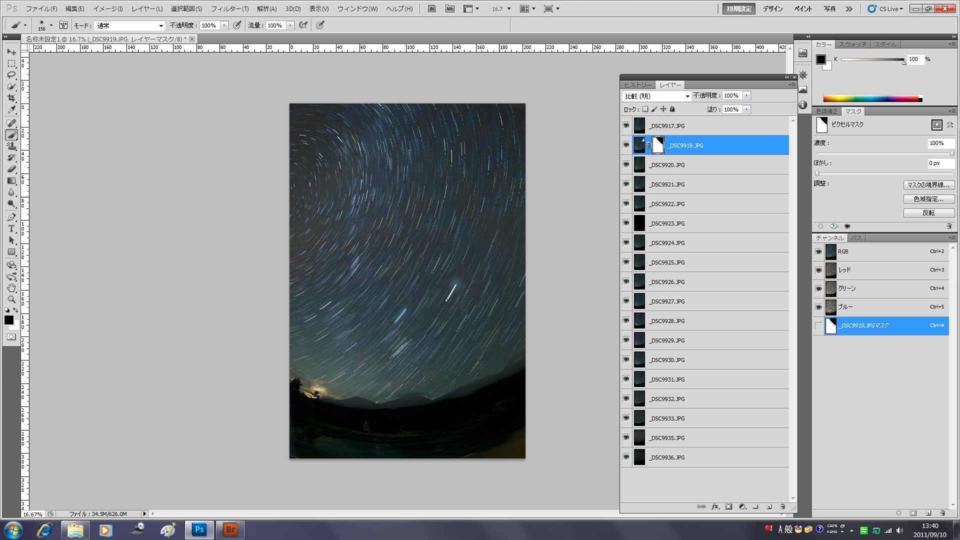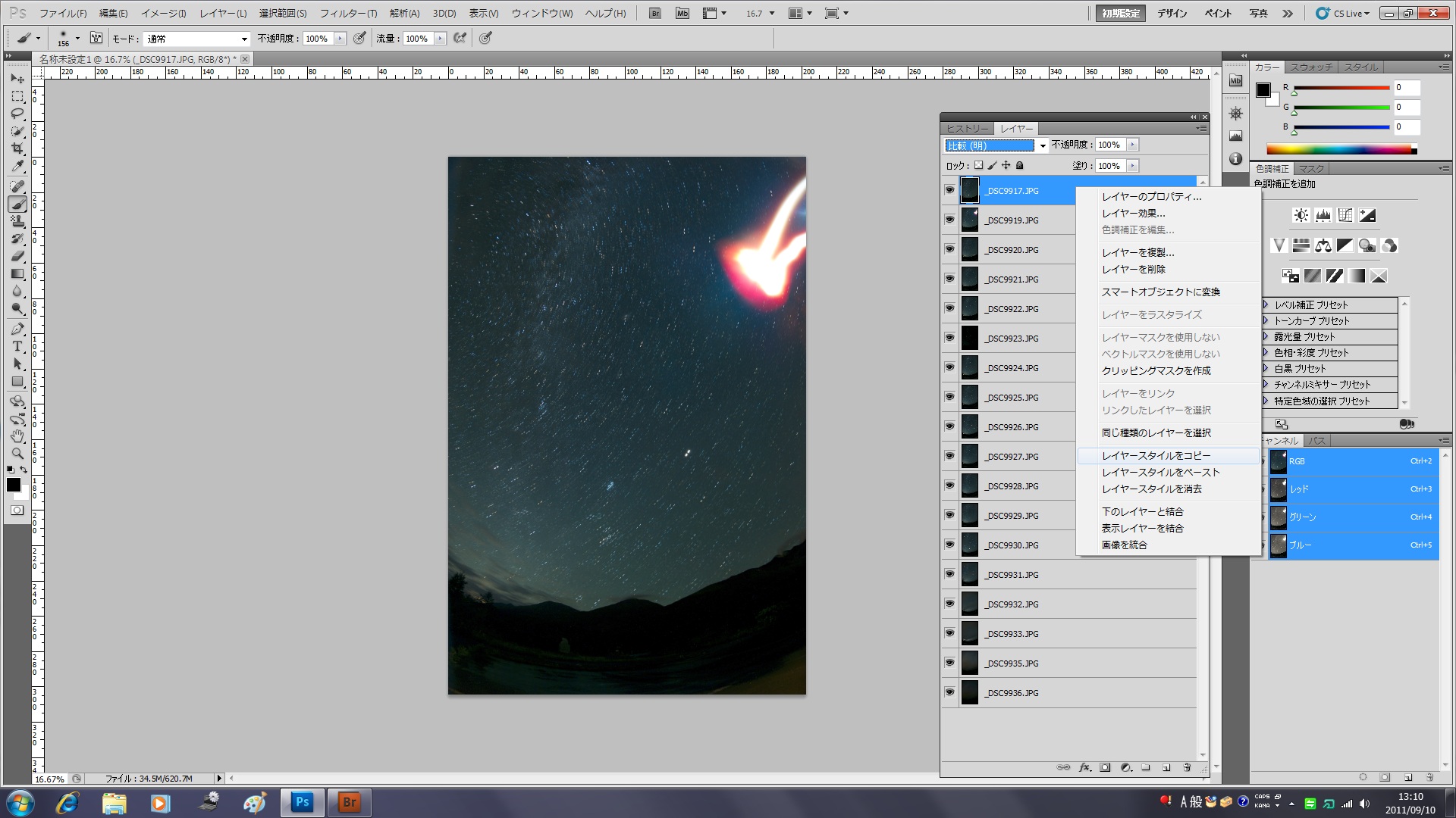 現像したJPGデータを全選択し「ツール」→「ファイルをPhotoshopレイヤーとして読み込み」で枚数分のレイヤーが作成される。