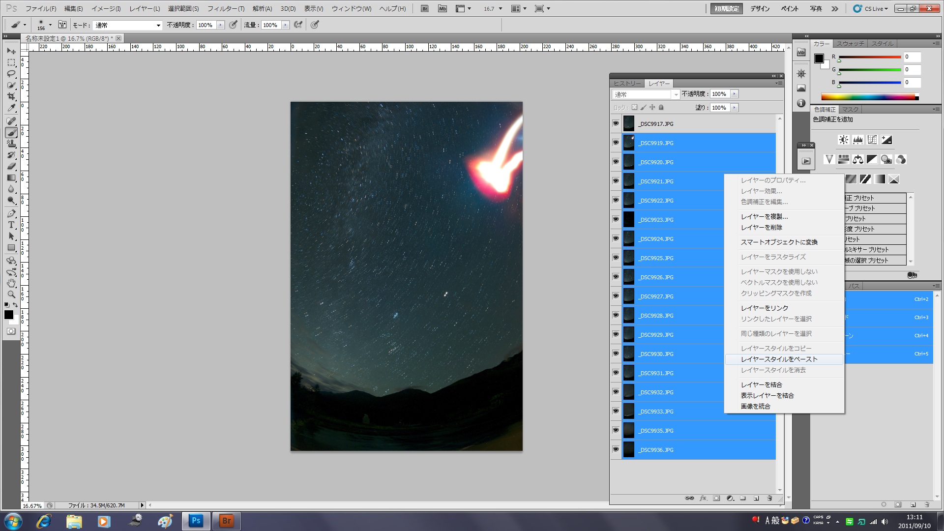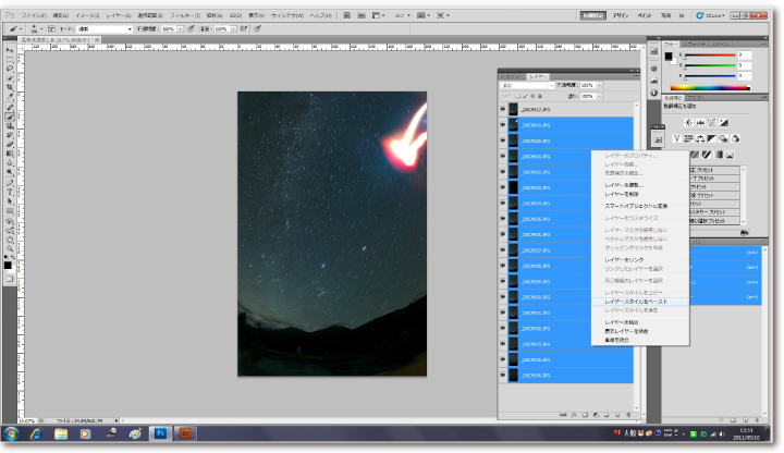 適応していない他のレイヤーを「Shift」と左クリックで全選択し、地色が変わったら右クリックし表れた項目から「レイヤースタイルをペースト」すると、先ほど1枚だけ適応した「比較(明)」が全画像に適応される。