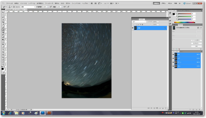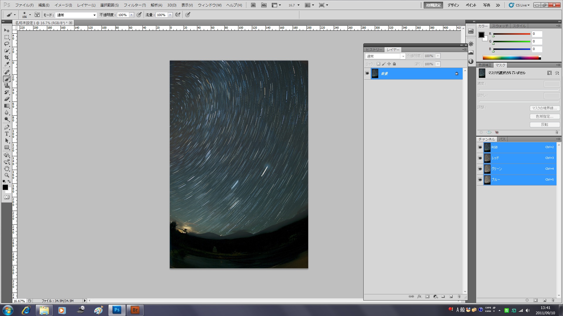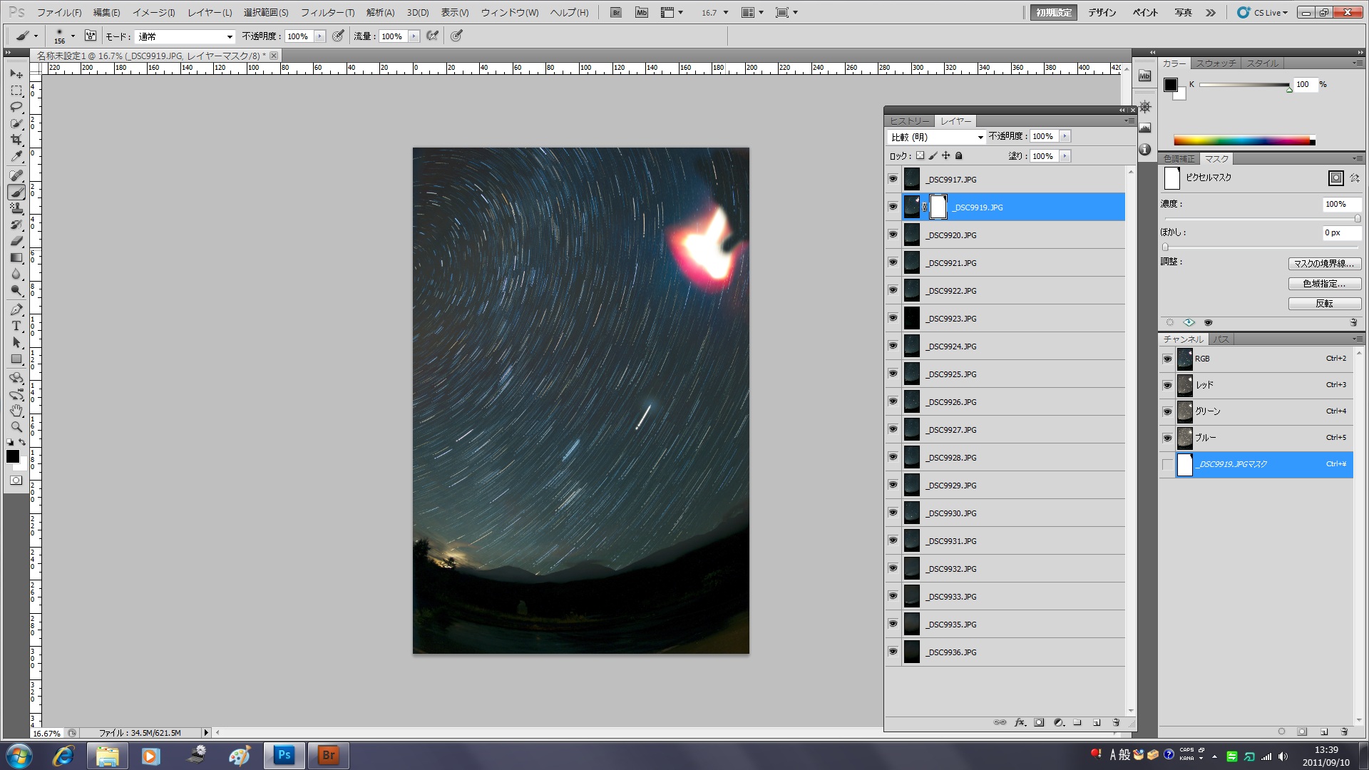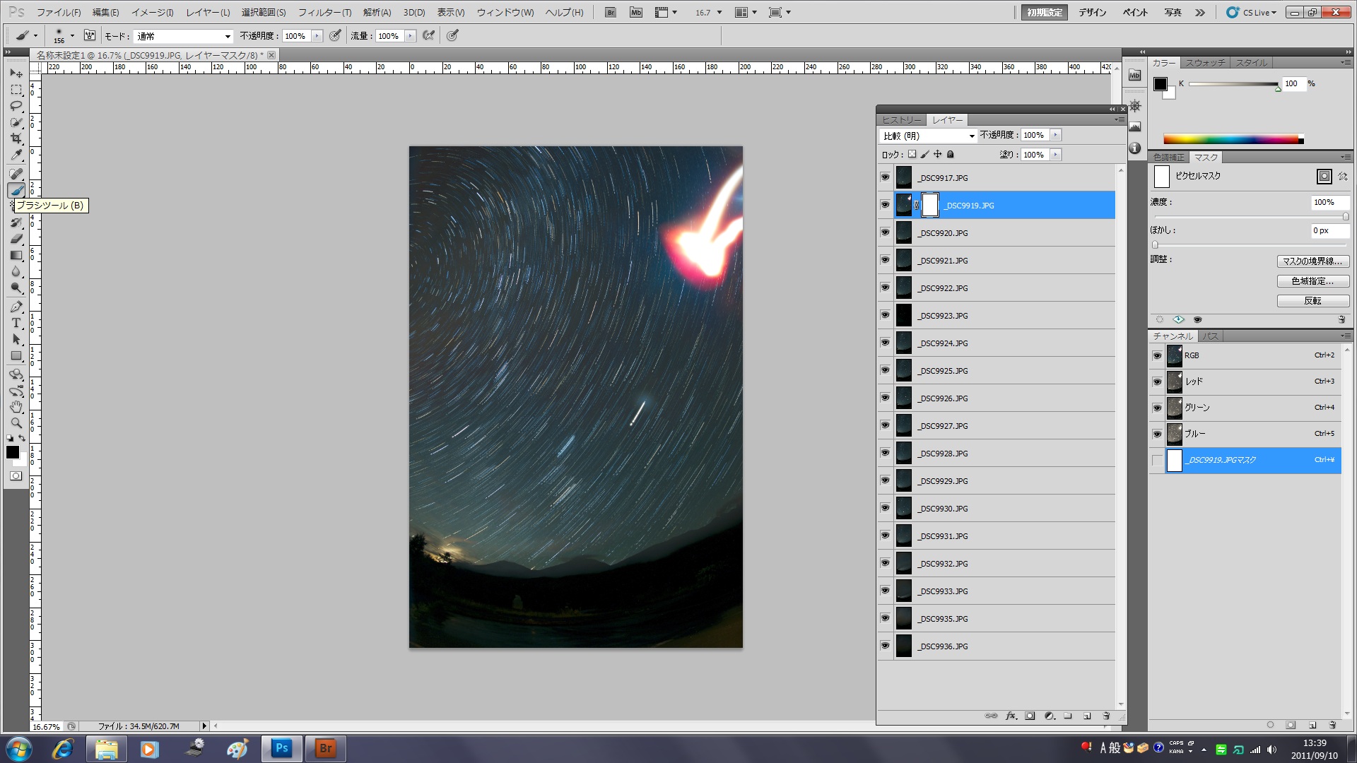ツールパレットから「ブラシツール」を選択。画像の中にある光の帯に「ブラシツール」を移動させ左クリックすると「マスク」が掛かり光の帯が消える。 周りに比べて明るく写り込んでいて画像の中に光が散っているので、広めにマスクを掛ける。この時「レイヤーマスクサムネイル」でマスクした部分を確認できるので適正な処理を施す。